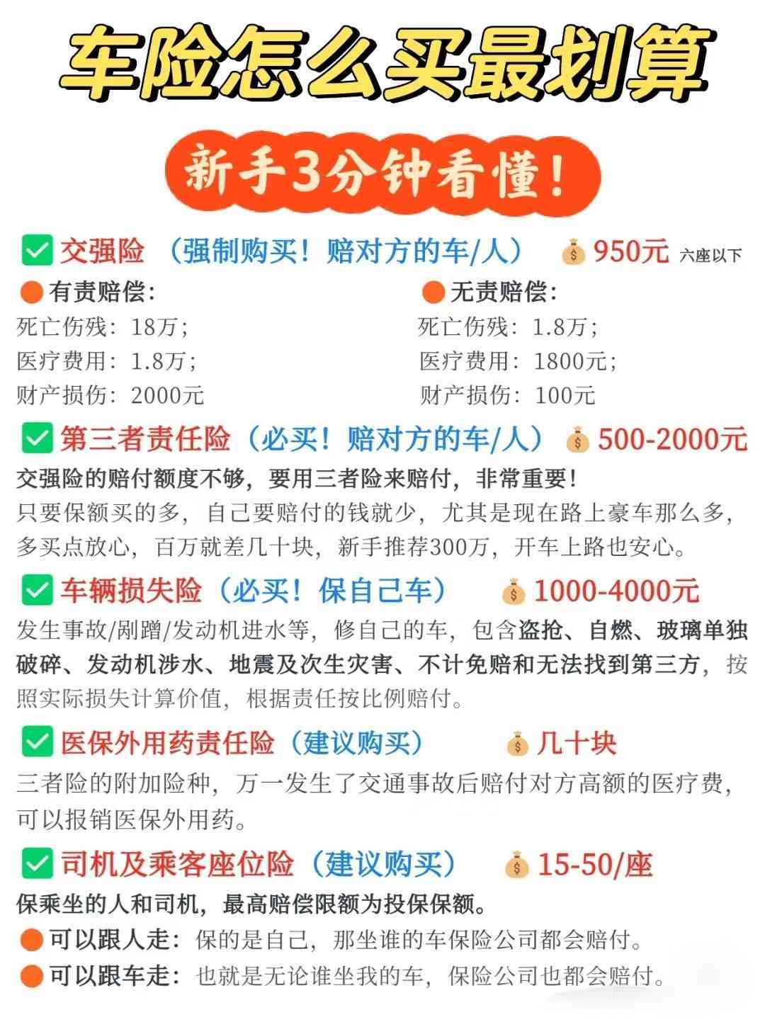2025年买新车,车险这样买更划算,别花冤枉钱! 很多新手买第一辆车的时候,不知道车险怎么买更划算 一不留神就买了一大堆,花钱不说,还不实用, 真正到了要用的时候发现报销不了。 今天给大家分享下超实用的车险购买攻略! 新手司机记得收藏哦。 那么,车险到底怎么买才最划算? 1交强险→不买不能上路哇 2车损险→新手上路,免不了磕碰的小事故 3三者险→性价比高,建议保额300w 4座位险→带家人出行的很有必要 另外,很多小伙伴买了不知道怎么用,今天也跟大家讲讲,车险怎么用才更省钱 ? 开车小刮小蹭,费用不超过500,自己承担; 费用超过500,走车损险 开车撞到人,医疗费用不超过1.8万,走交强险; 医疗费用超过1.8万 三者险 开车撞到别人的车,300以内自己出; 300-2000走交强险, 2000-2500走交强险; 超过2500走交强险+三者险 发生自然灾害(水淹、冰雹), 任何费用都走车损险 车坏了,需要救援,免费救援、拖车等, 打保险公司电话,也可以一键报警